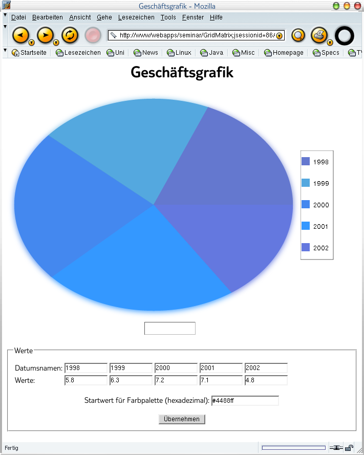Gegenstand der Seminararbeit war die Erarbeitung serverseitiger Komponenten, mit denen Daten in üblichen Businessgrafiktypen (Säulendiagramm, Tortendiagramm, Liniendiagramm) auf einfache Weise mit SVG dargestellt werden können. Dazu wurden zunächst aktuelle Entwicklungen im SVG-Umfeld betrachtet und mit diesen Möglichkeiten eine API entwickelt. Mit dieser API wiederum wurden serverseitige Komponenten entwickelt, die die angesprochenen Möglichkeiten zur Visualisierung von Daten bieten. Dabei handelt es sich zum einen um ein Servlet, das aus Parametern eine Grafik mit Möglichkeiten zur Skript-gesteuerten Interaktion aufbaut, zum anderen um eine Komponente für das Cocoon-Framework, die aus einer XML-Datenquelle eine entsprechende Grafik generiert.